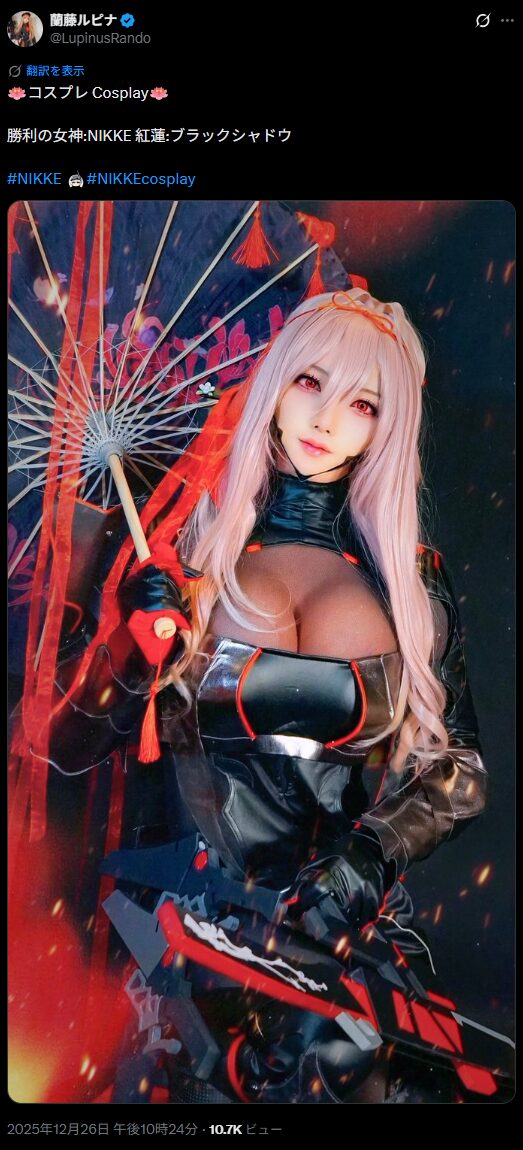 コスプレイヤーの蘭藤ルピナさんが12月26日、人気スマートフォンゲーム『勝利の女神:NIKKE』のキャラクター【紅蓮 ブラックシャドウ】のコスプレ写真をXで投稿しました。