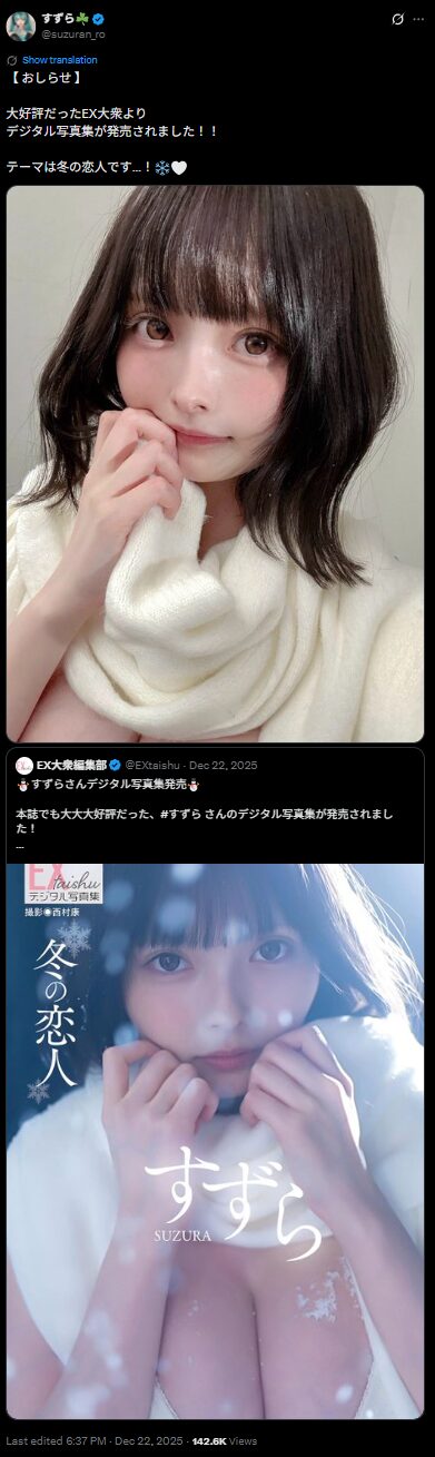 コスプレイヤーのすずらさんが12月22日、EX大衆編集部より発売されたデジタル写真集のお知らせをXで投稿しました。