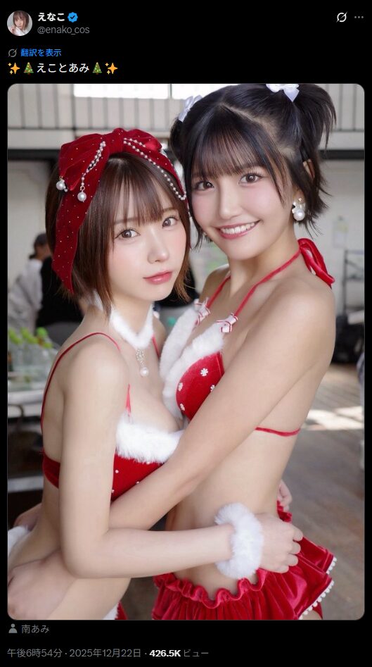 人気コスプレイヤーのえなこさんが12月22日、南あみさんとのクリスマスサンタコスプレ2ショット写真をXで投稿しました。