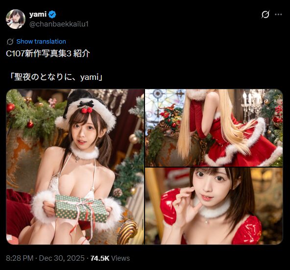 魔法少女・モデル・コスプレイヤーのyamiさんが12月30日、コミックマーケット107で新作写真集「聖夜となりに、yami」の紹介をXで投稿しました。