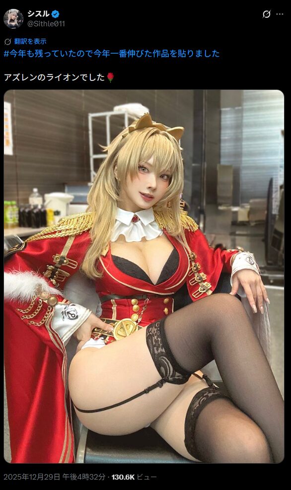 コスプレイヤーのシスルさんが12月29日、今年一番伸びた作品として『アズールレーン』のキャラクター【ライオン】のコスプレ写真をXで投稿しました。
