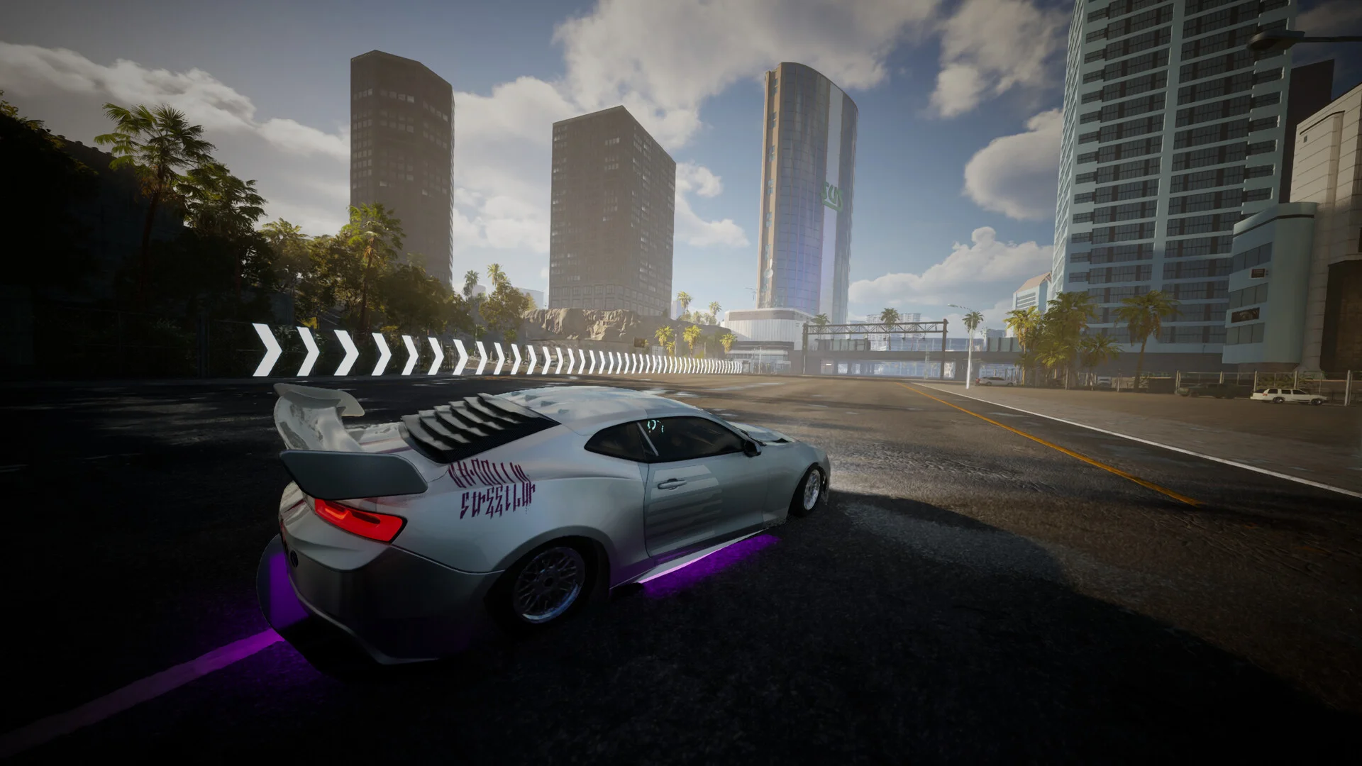 カスタマイズした愛車で、いよいよ公道へ繰り出します。本作の舞台は広大なオープンワールドで、高層ビルが立ち並ぶ現代的な都市から、ヤシの木が揺れる美しい海岸線、廃墟と化した工業地帯まで、多彩なロケーションが用意されています。