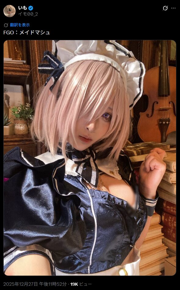 コスプレイヤーのいもさんが12月27日、人気ゲーム『Fate/Grand Order』のキャラクター「マシュ・キリエライト」のメイド服バージョンのコスプレ写真をXで投稿しました。