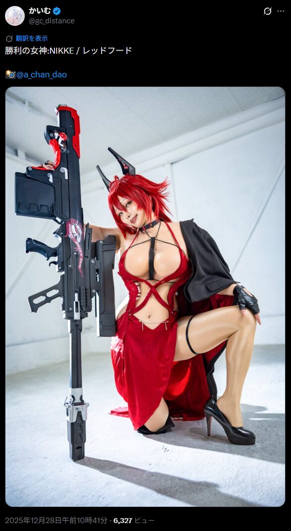 関西在住コスプレイヤーのかいむさんが12月28日、人気スマートフォンゲーム『勝利の女神:NIKKE』のキャラクター「レッドフード」のコスプレ写真をXで投稿しました。