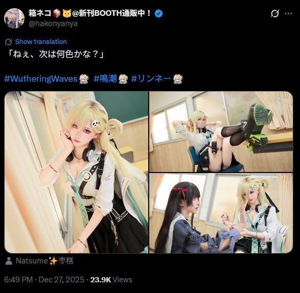 ゲーム大好きコスプレイヤーの箱ネコさんが12月27日、人気アクションRPG『鳴潮(WutheringWaves)』のキャラクター「リンネー」のコスプレ写真をXで投稿しました。