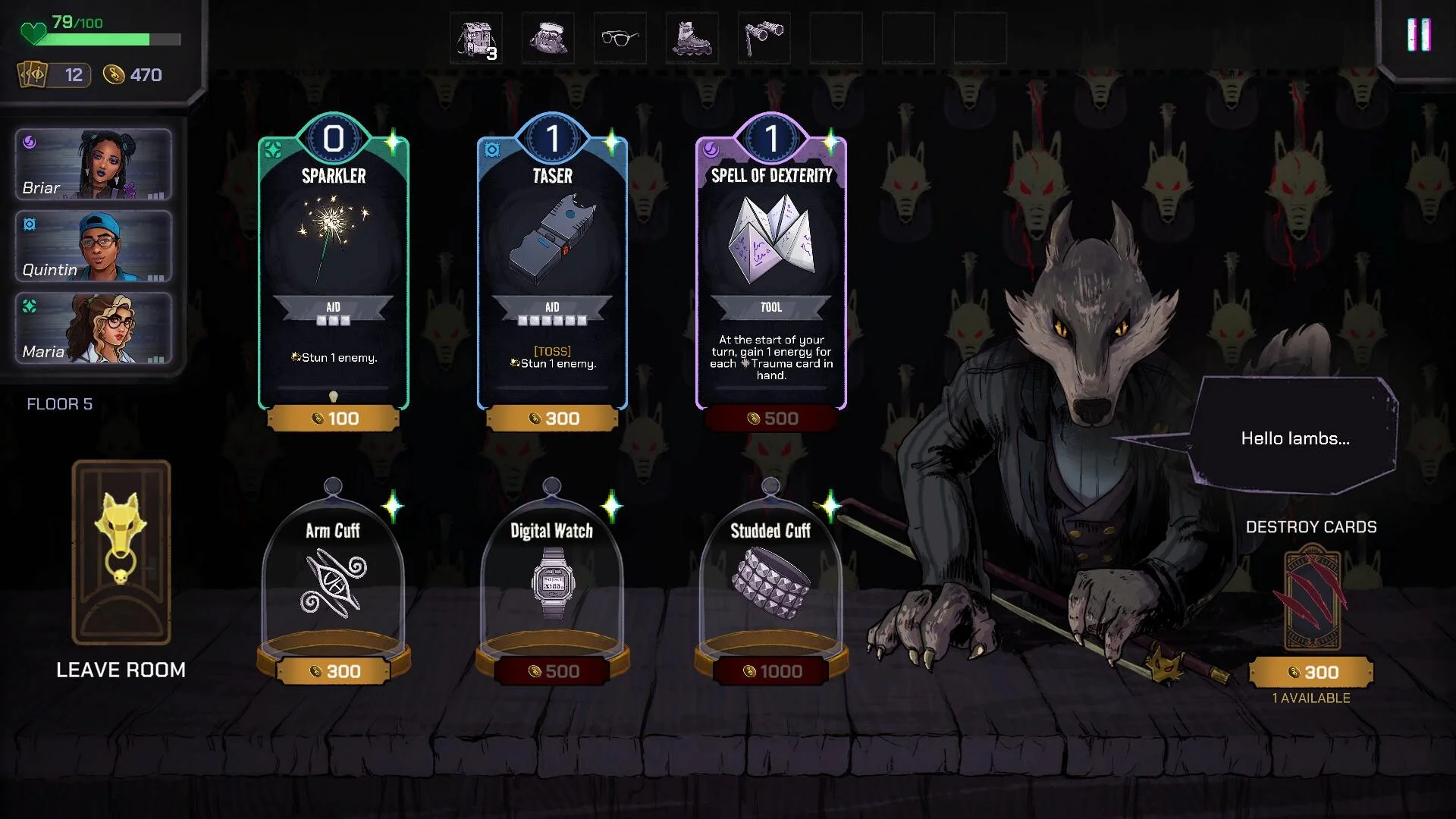 ホテル内の探索では、部屋ごとにさまざまなイベントが発生します。新たな装備品を発見する「Discovery」イベントでは、「Flight Jacket」のようなバトルで役立つアイテムを手に入れるか、それとも置いていくかの選択を迫られます。また、謎めいた商人が現れるショップでは、狼男のような怪しげな店主から新しいカードや装備品を購入できます。「Hello lambs…」という彼のセリフが、ゲームの不気味な雰囲気をさらに高めています。