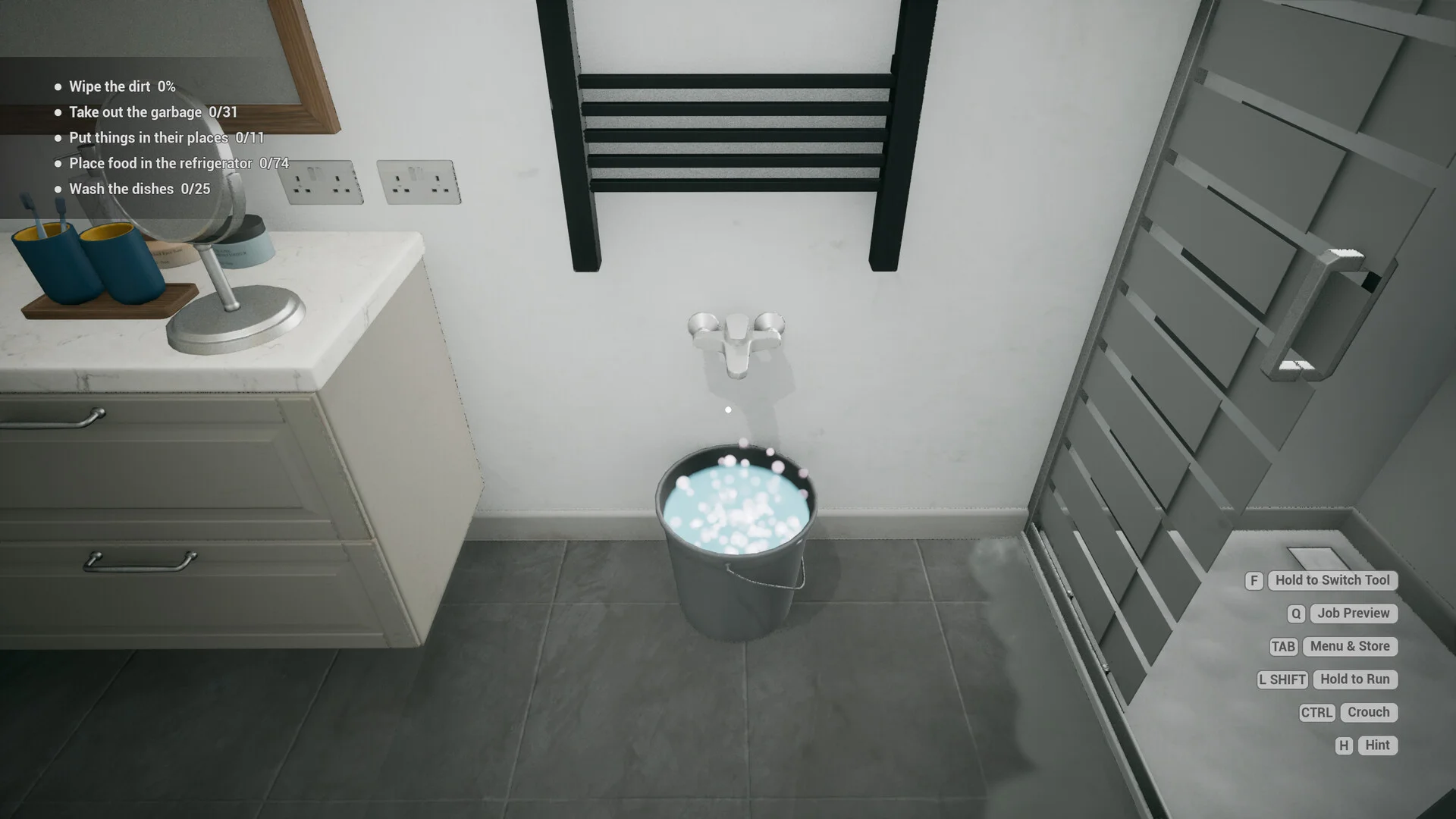 本作では、実にさまざまな清掃ツールが用意されています。モップで床を拭き、スポンジで表面をこすり、食器を食洗機に入れ、ゴミを集め、ハエを殺虫スプレーで駆除し、カーペットを掃除し、散らかった物を整理整頓していきます。頑固な汚れには高圧洗浄機を使って、一気に汚れを吹き飛ばすことも可能です。