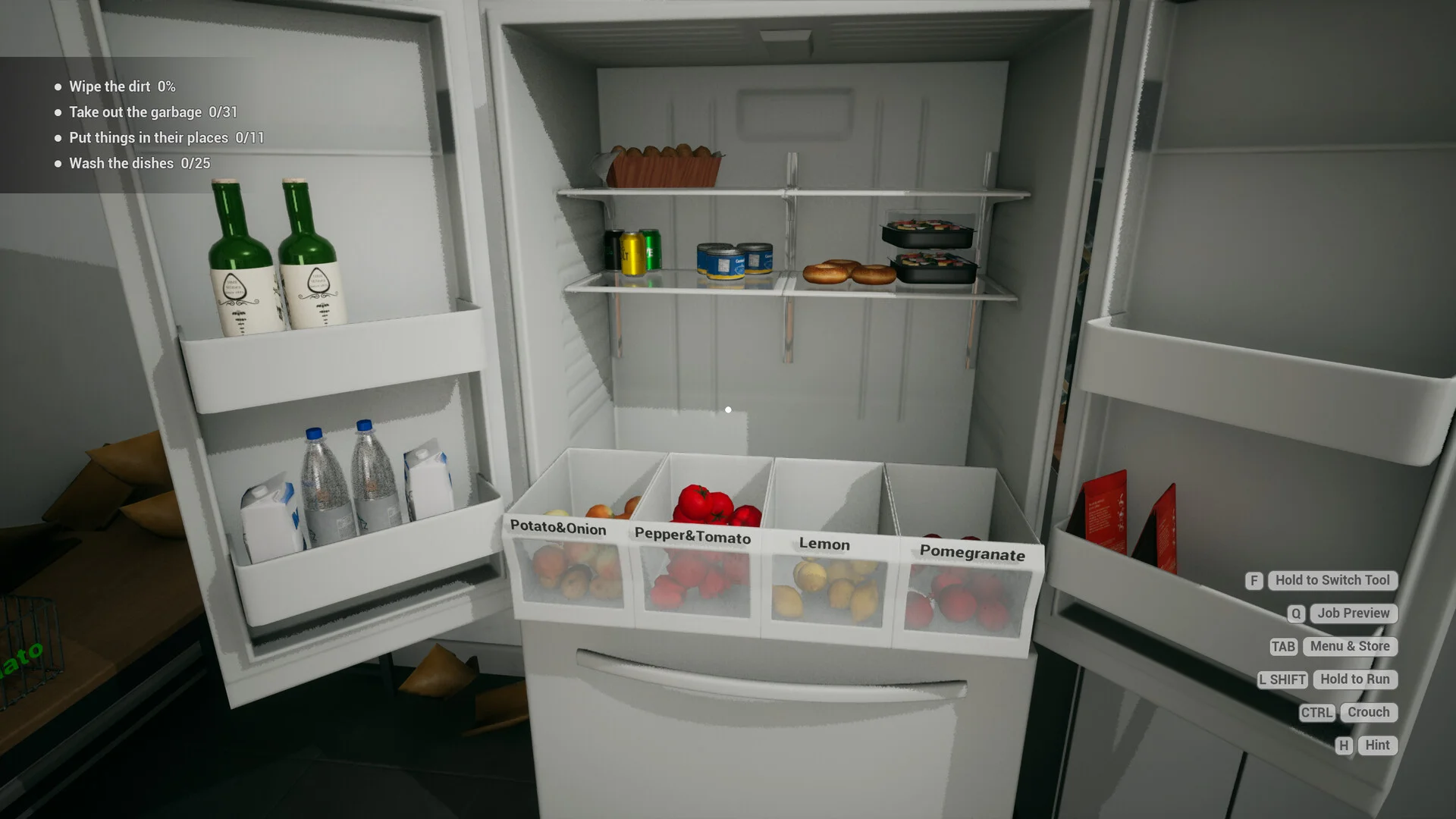 清掃作業の合間には、冷蔵庫の中を種類別に整理整頓したり、バケツに水を汲む準備をしたり、ゴミをコンテナに投入したりと、細かな作業も丁寧に再現されています。こうした日常的な動作が丁寧に描かれることで、あなたは清掃員としての役割に深く没入できるでしょう。