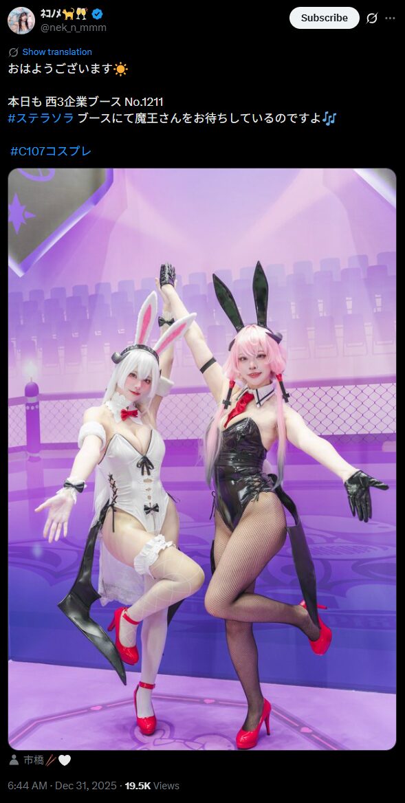コスプレイヤーのネコノメさんが12月31日、コミケ107二日目の企業ブース出演についてXで投稿しました。