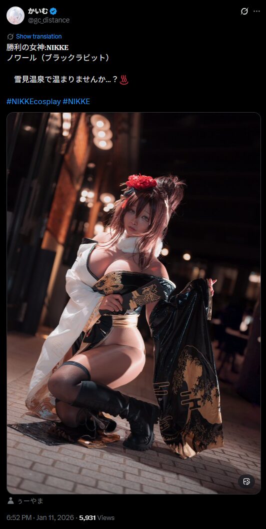 関西在住コスプレイヤーのかいむさんが1月11日、人気ゲーム『勝利の女神:NIKKE』のキャラクター【ノワール(ブラックラビット)】のコスプレ写真をXで投稿しました。