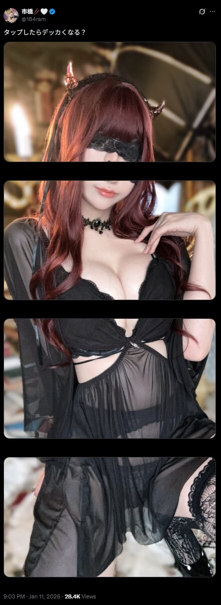 コスプレイヤーの市橋さんが1月11日、黒いレースのランジェリー姿の写真をXで投稿しました。