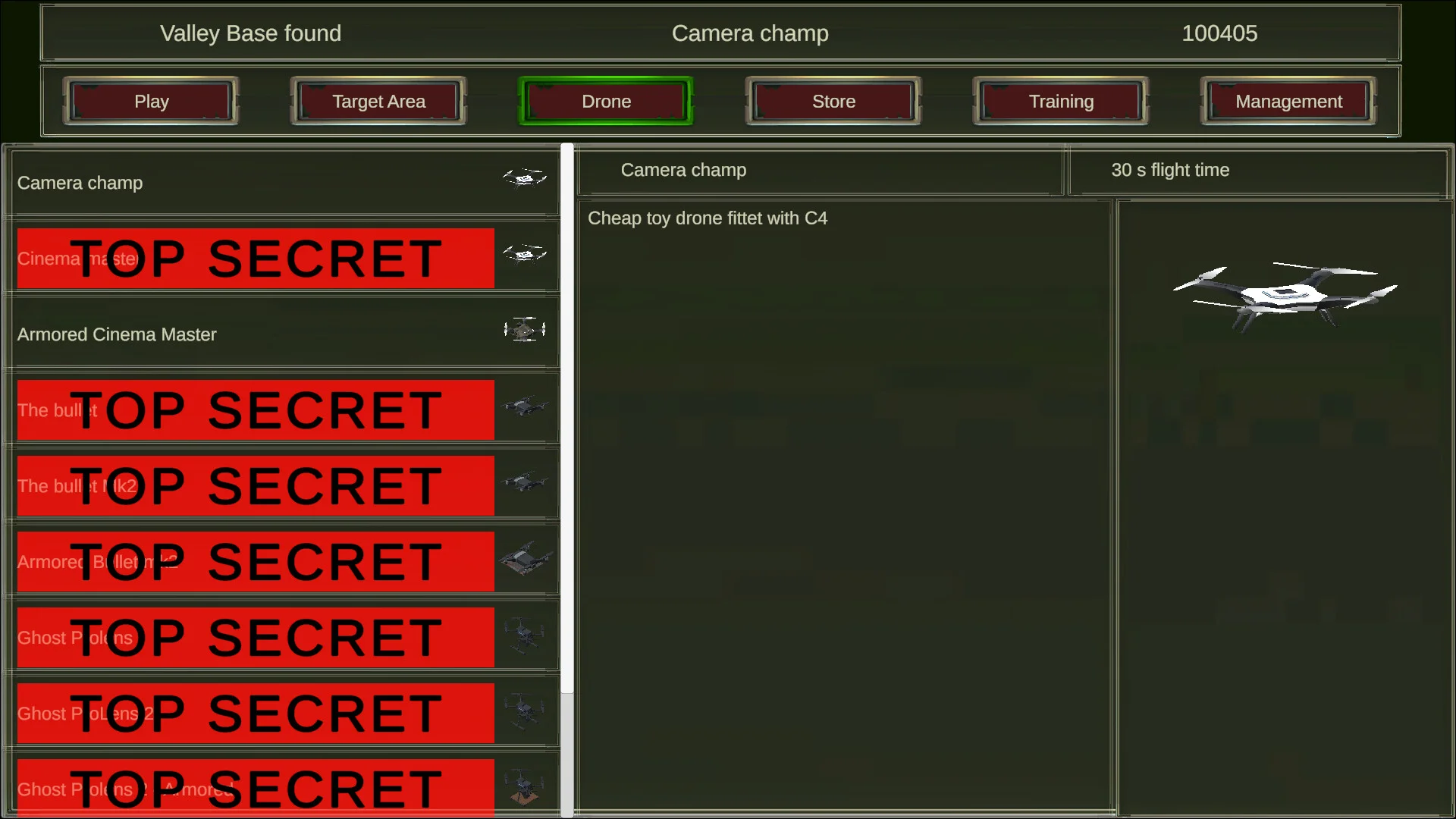 ドローンリストには「TOP SECRET(最高機密)」と表示された未解放の機体も多数存在しており、より高性能なドローンを手に入れるために、プレイヤーは資金を貯めて挑戦を続けることになるでしょう。また、新たなターゲットエリアも購入可能で、それぞれのエリアにはプレビュー画像と説明文が用意されています。たとえば「The Sandy Rocks」は敵の支配下にある砂漠の奥地という設定で、より困難なミッションが待ち受けているようです。