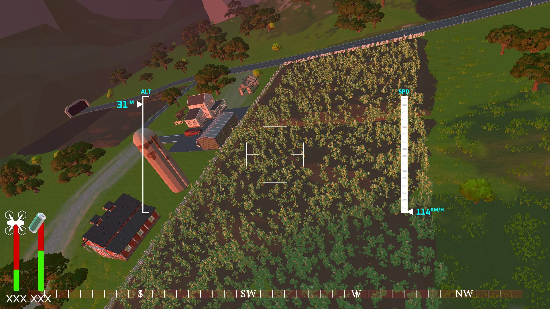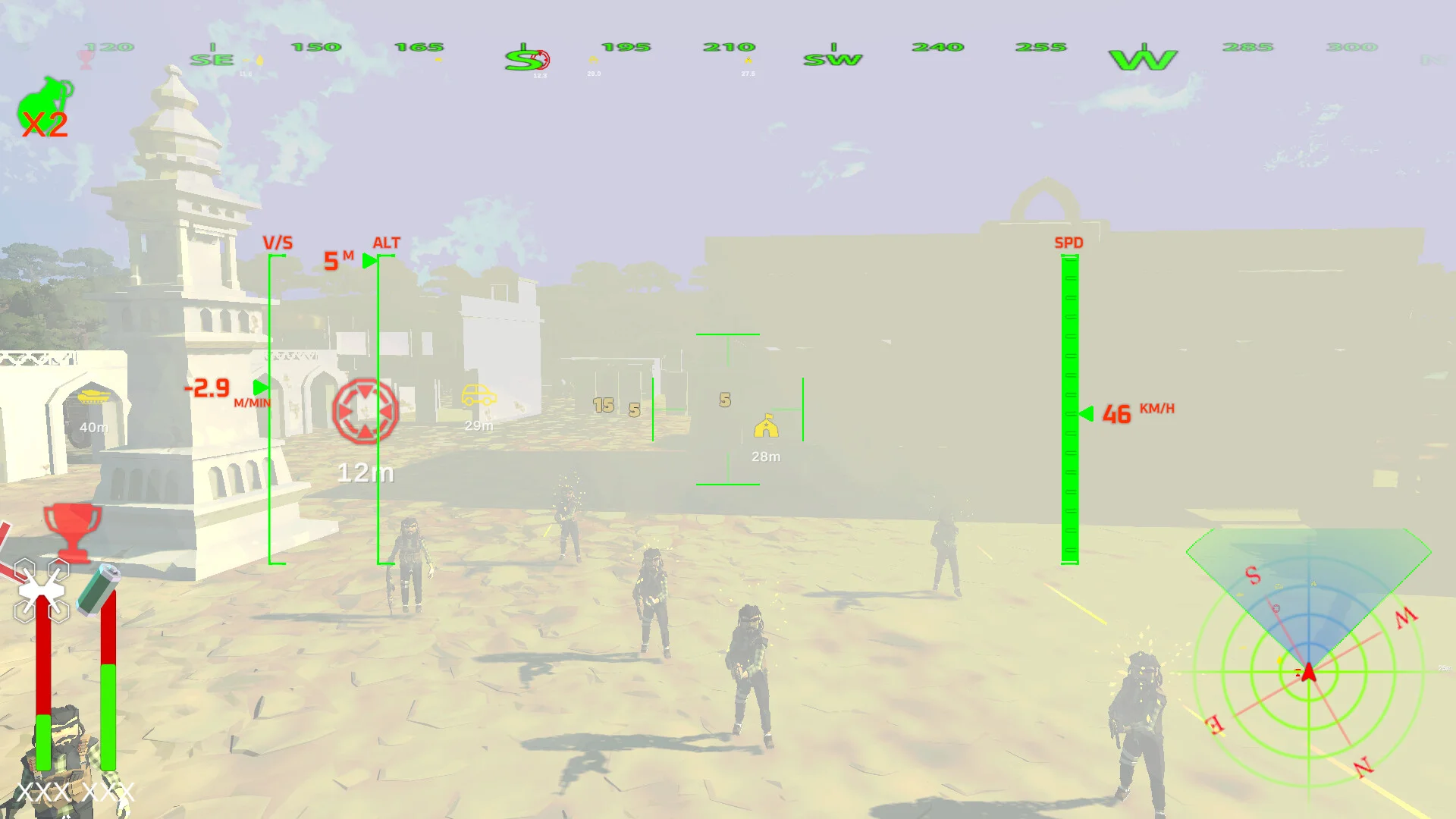 ドローンの操縦は本格的なHUD(ヘッドアップディスプレイ)を通じて行われます。方位、高度、垂直速度、対地速度といった飛行情報がリアルタイムで表示され、まるで実際のドローンパイロットになったかのような没入感が味わえます。レーダーも搭載されており、周囲の敵の位置や地形を把握しながら、戦略的に行動することが求められます。