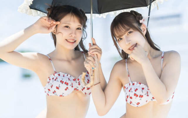 さくらとまよのキラキラビーチコーデ! 猫宮さきと長生まよ、さくらんぼ柄ビキニで太陽の下でツーショット