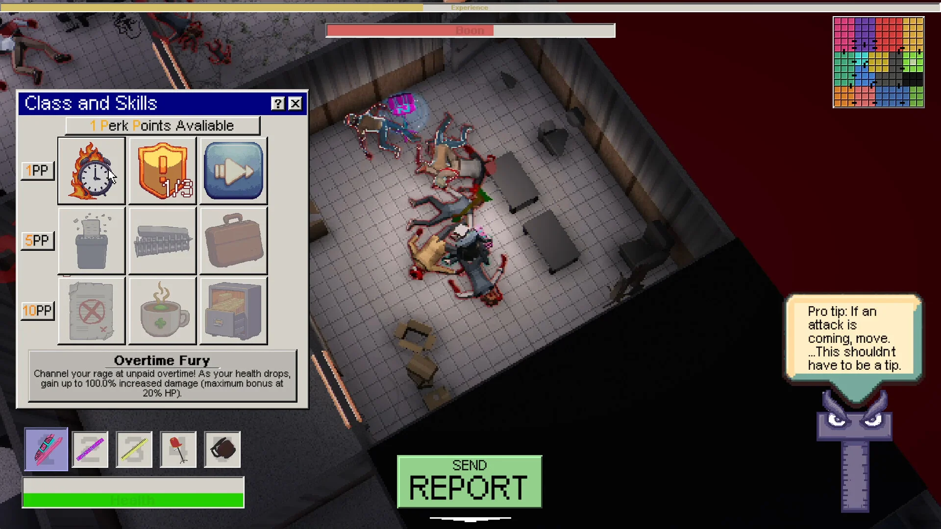 レベルアップすると、スキルポイントを獲得してスキルツリーからさまざまな能力を習得できます。「Overtime Fury(残業の怒り)」など、オフィスワークを皮肉ったネーミングのスキルが並び、ゲームの世界観を強調しています。スキルの選択によって、プレイヤーは自分だけの戦闘スタイルを確立していくことができるでしょう。