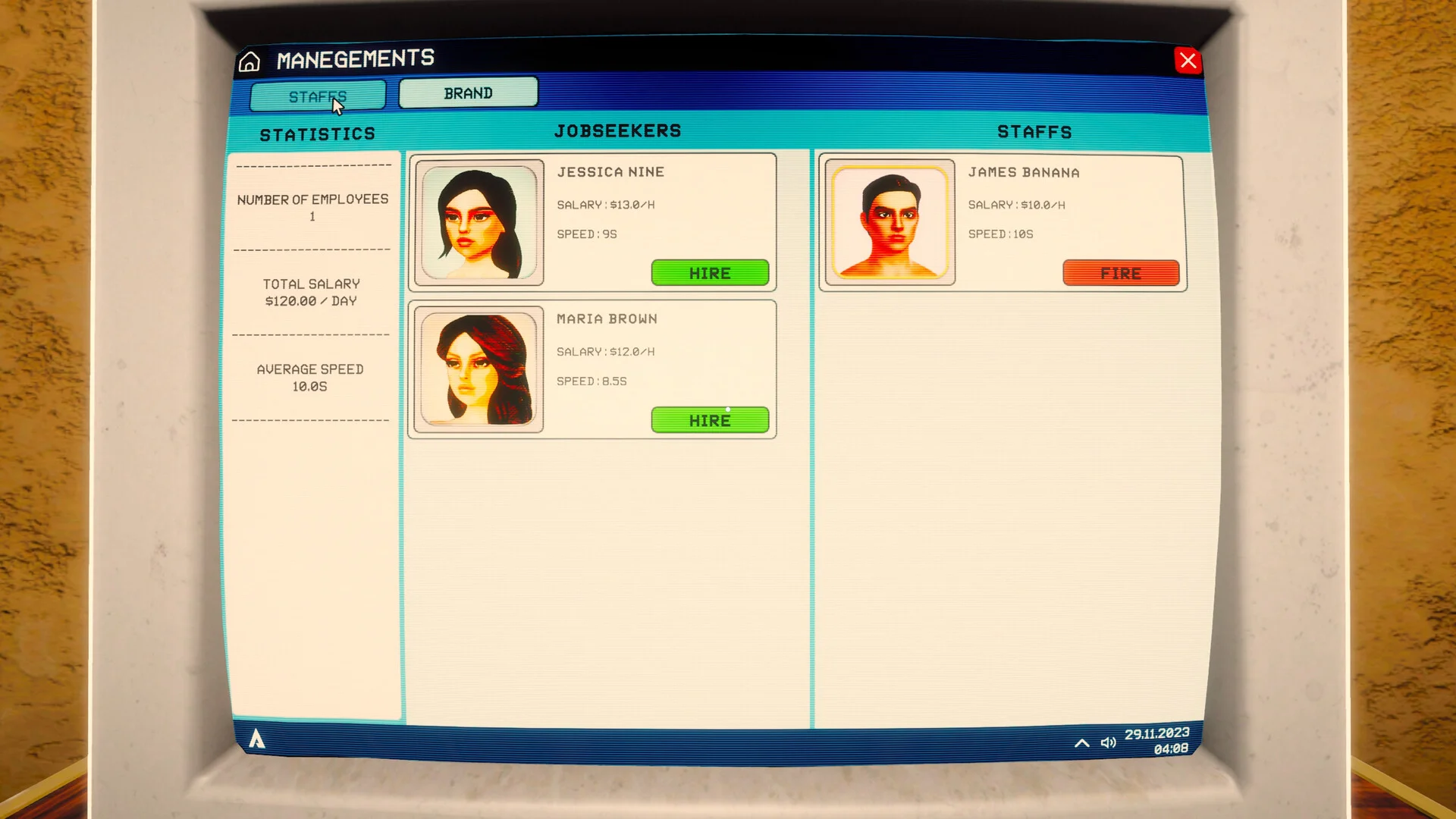 ゲームを進めていくと、スタッフを雇用してビジネスを効率化することも可能になります。スタッフ管理画面では、各候補者の能力値(給料、スピードなど)をチェックし、最適な人材を雇用できます。あなたの右腕となるスタッフを見つけ、育成し、共にブランドを成長させていきましょう。