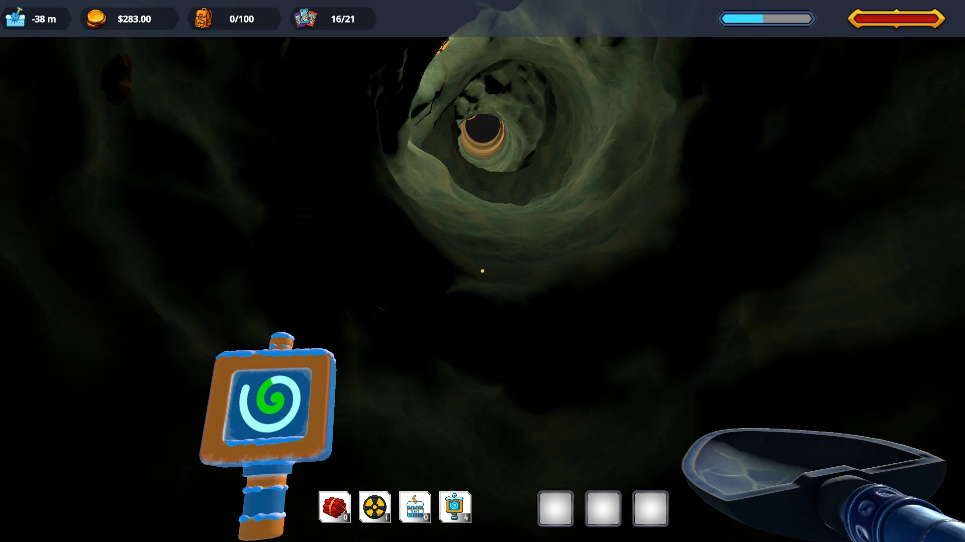 採掘の醍醐味は、何が埋まっているか分からないというワクワク感です。スコップを手に螺旋状に続く洞窟を進んでいくと、突然レアな鉱石が現れたり、思わぬ場所でカードパックを発見したりします。地下深くへと続く道のりは、まさに未知への冒険そのものです。
