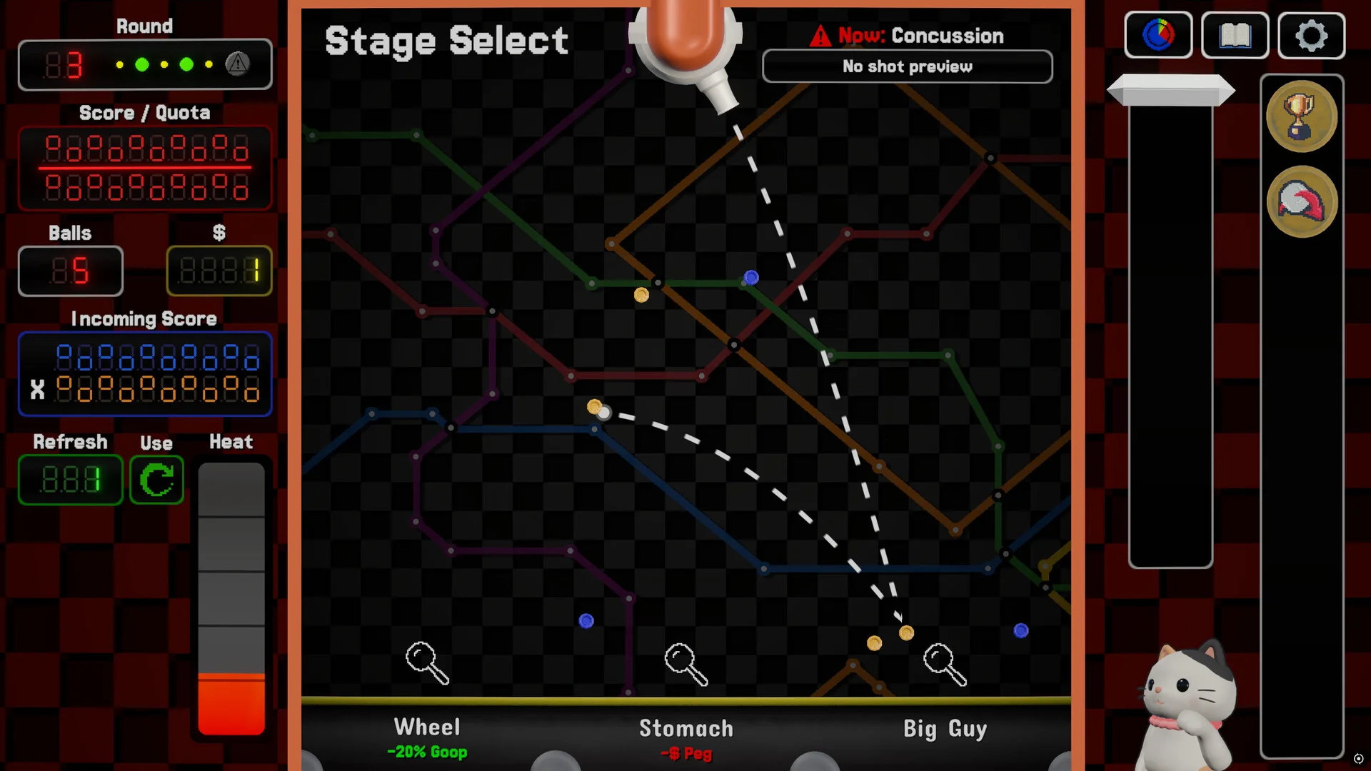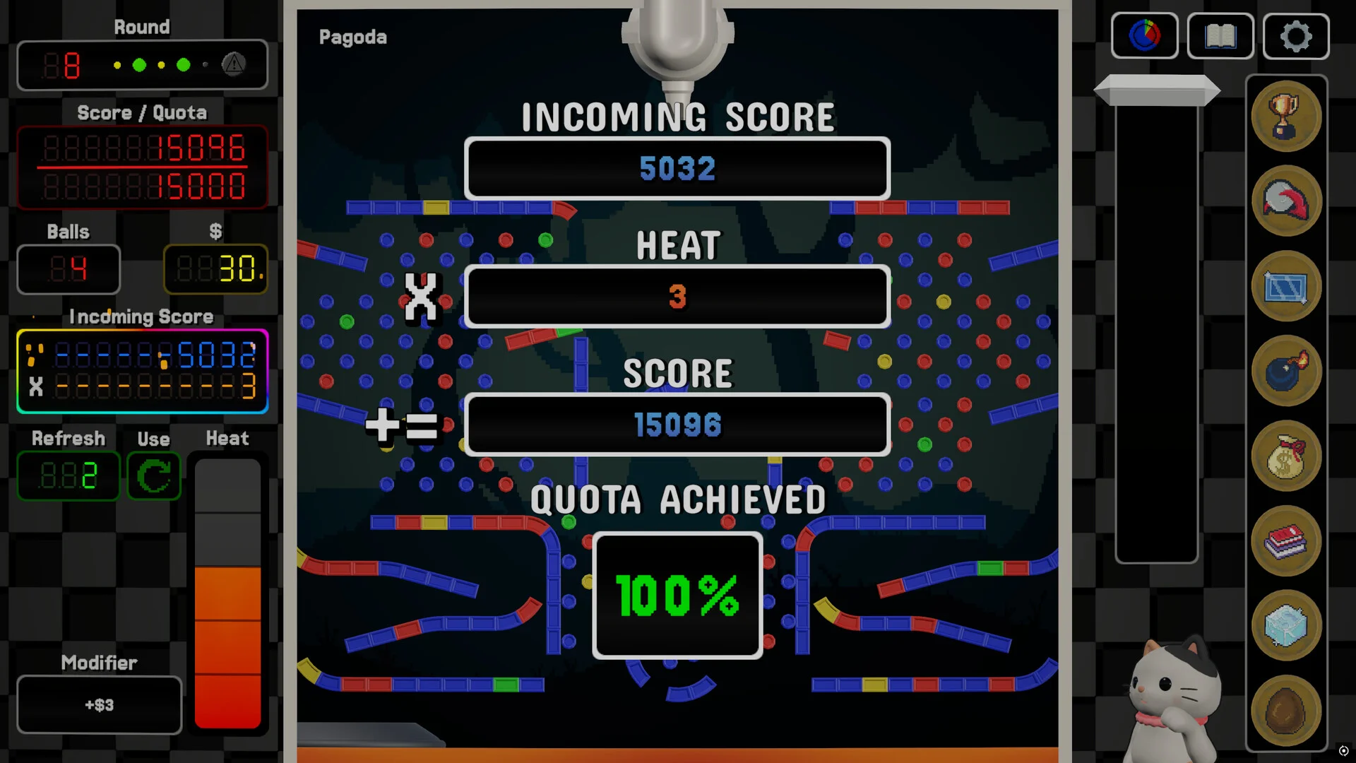 本作の醍醐味は、なんといってもトークンシステムにあります。ラウンドとラウンドの間にはショップが登場し、プレイヤーは獲得した資金でさまざまなトークンを購入できます。各トークンには固有の効果があり、「前ターンから25%のヒートを保持する」といった継続効果を持つものから、ペグの破壊時にボーナススコアを獲得できるものまで多種多様です。