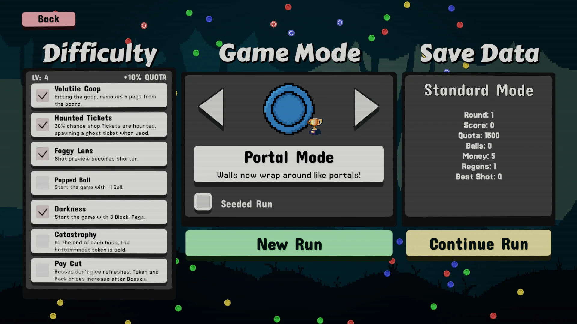 ゲーム開始時には難易度やゲームモードを選択できます。「Portal Mode」では壁がポータルのように機能し、ボールが画面の端から反対側に出現するといった特殊なルールが適用されます。また、「Volatile Goop」「Haunted Tickets」「Foggy Lens」といった修飾子(モディファイア)を追加することで、さらに難易度を調整することも可能です。