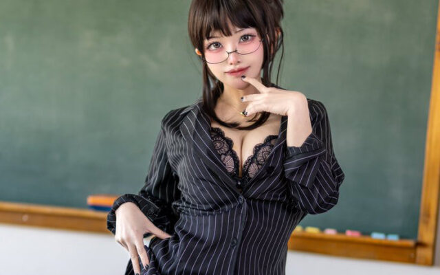 セクシーな眼鏡女教師! さや、黒ストライプスーツで大人っぽい魅力を披露