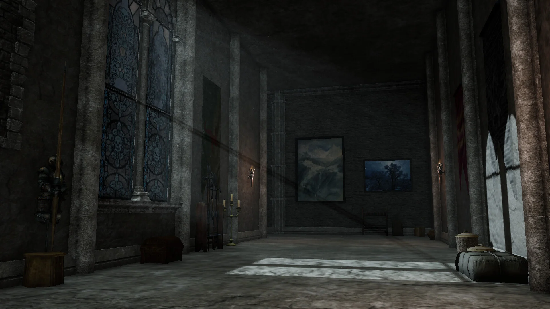 ダンジョン内だけでなく、夜の集落のような拠点エリアらしき場所も確認でき、NPCとのやり取りや装備の整備なども楽しめる様子です。ステンドグラスから光が差し込む荘厳な大広間など、世界観の作り込みにも力が入っています。