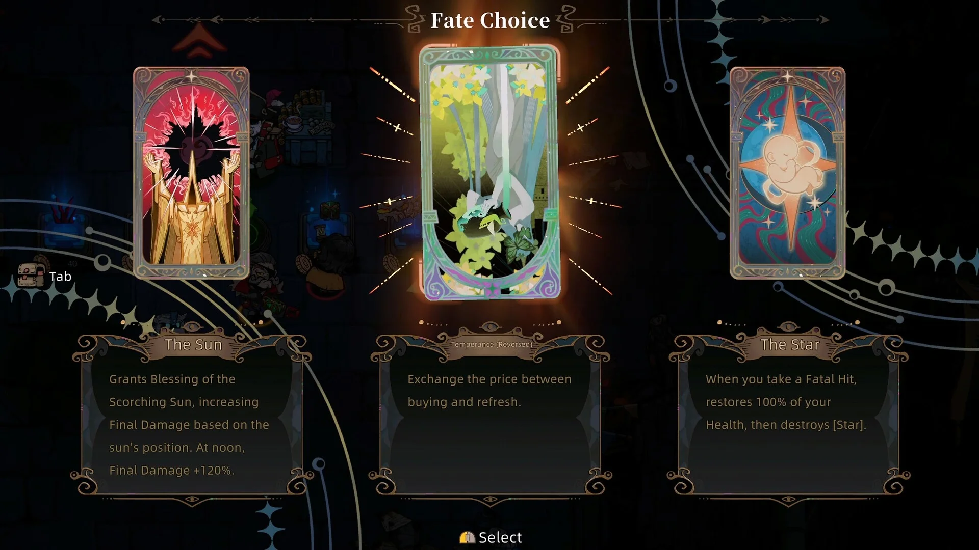 ゲームプレイはローグライト形式のバレットヘル(弾幕)シューターとして展開されます。プレイ中には「運命の選択」と題されたカード選択画面が登場し、タロットカードを思わせる美麗なイラストつきの選択肢のなかからスキルや強化を選んでいきます。この選択が毎回異なるため、周回ごとに違った戦略を楽しめるリプレイ性の高さが期待できます。