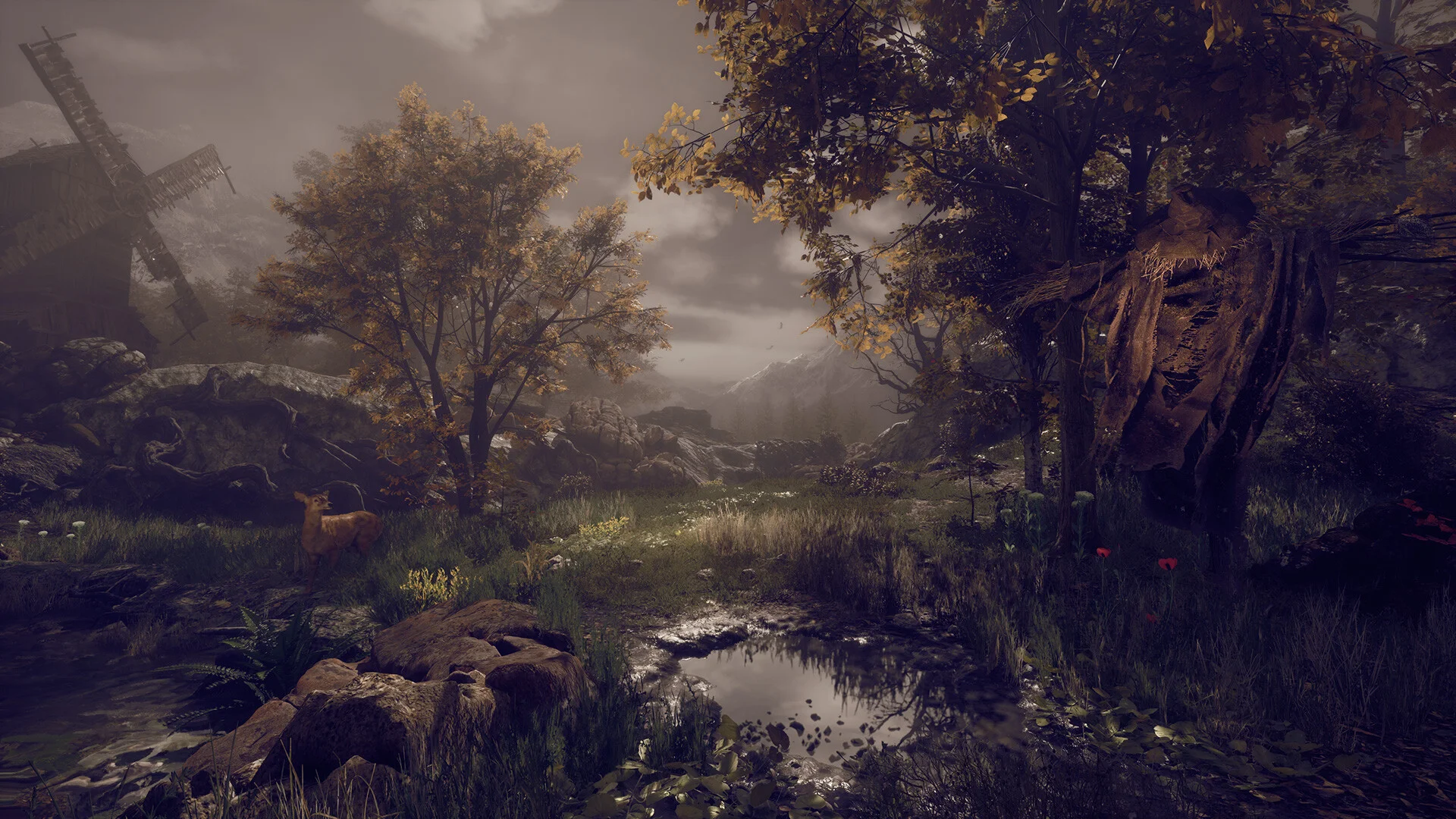 スクリーンショットを見ると、霧に包まれた広大な森、紅葉した木々、古びた石橋や小屋など、静謐で美しいビジュアルが広がっています。言葉ではなく、光・音・静けさによって物語が語られるというコンセプトが、映像からもしっかり伝わってきます。