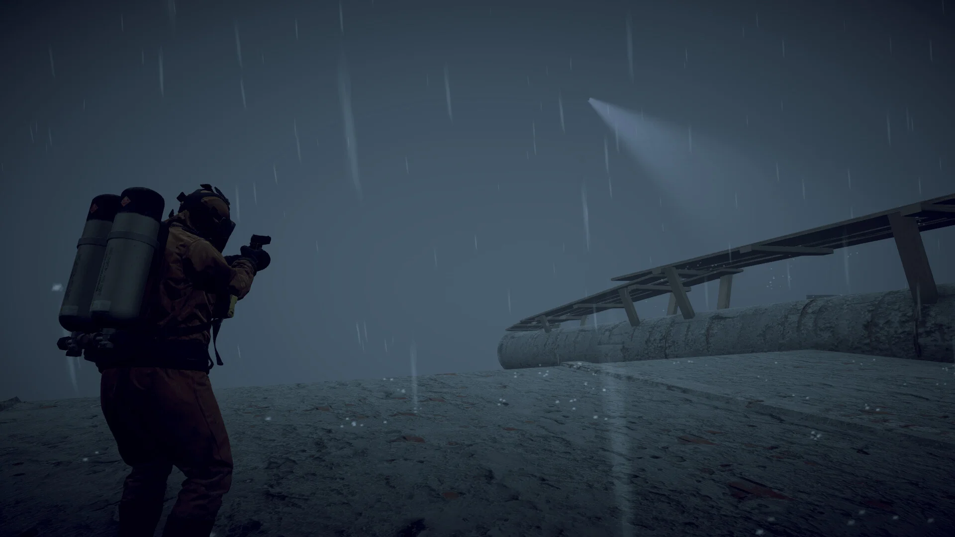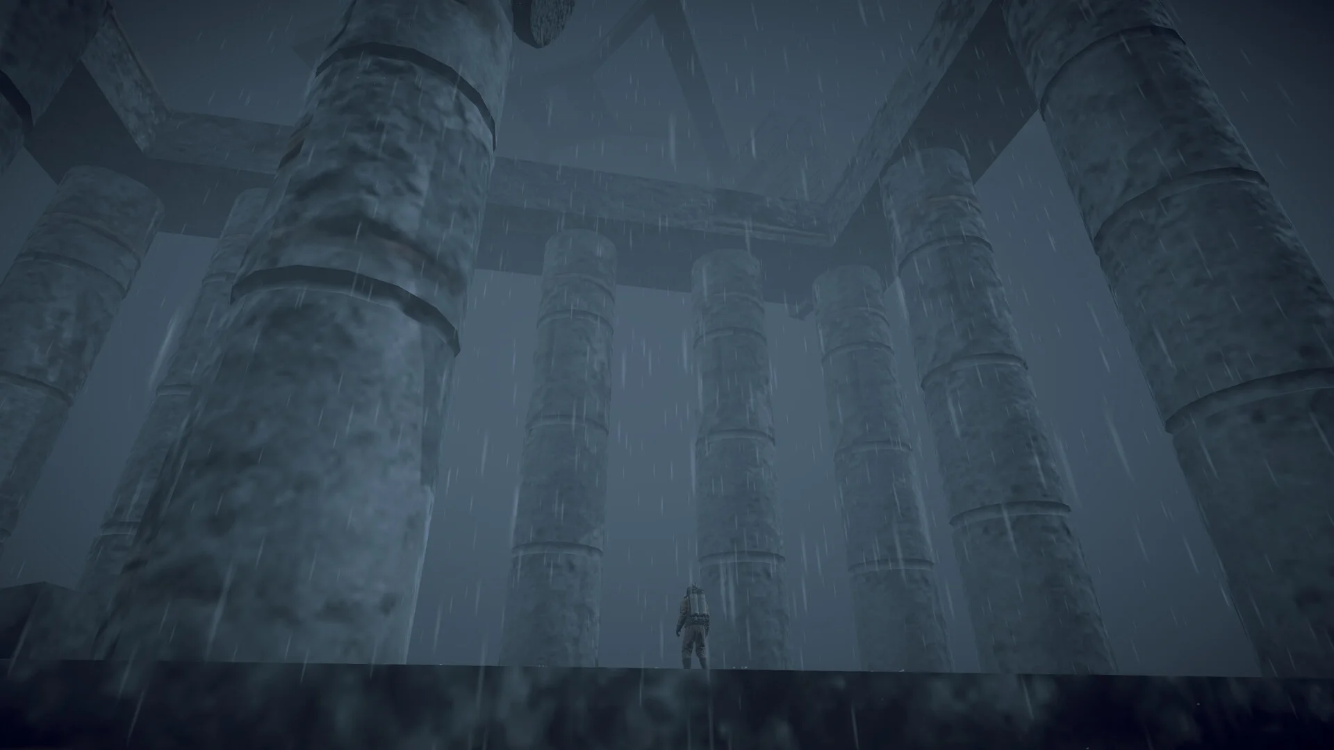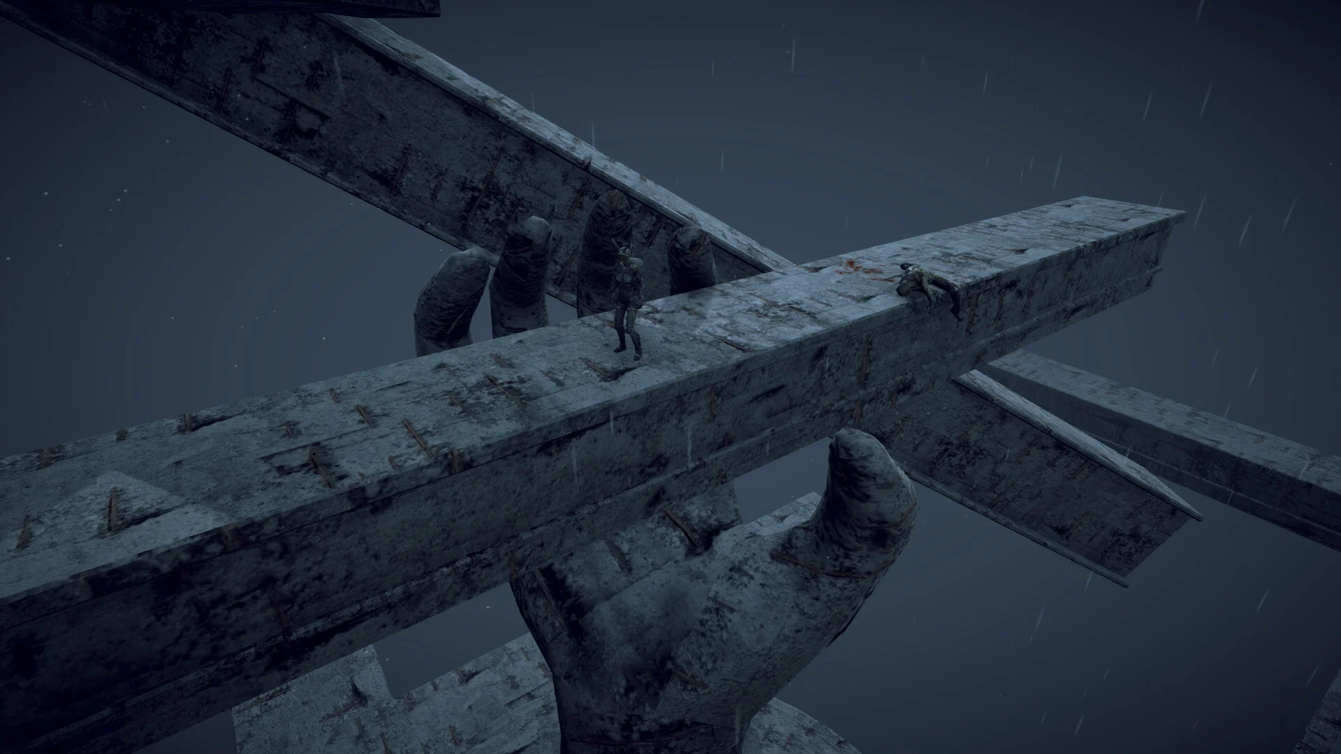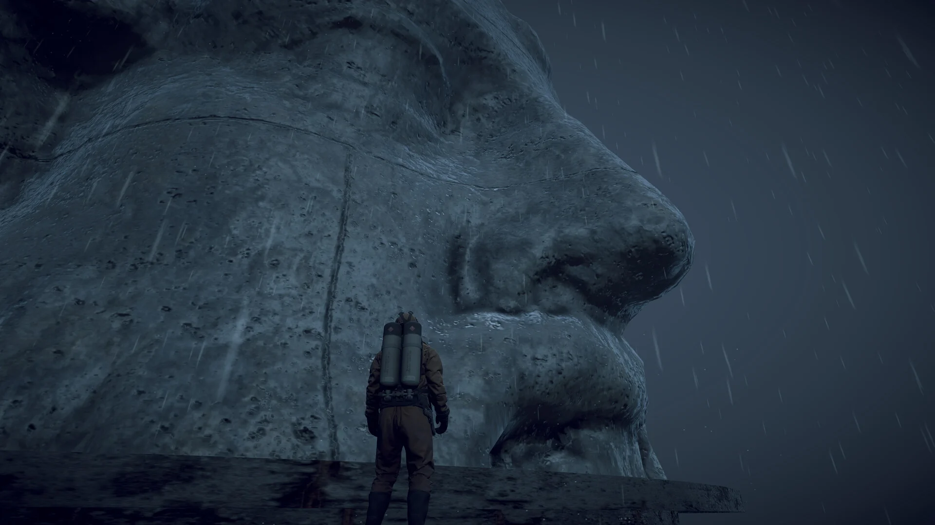 ビジュアル面では、激しい雨や霧のエフェクトが随所に取り入れられており、終末世界の荒廃した雰囲気をうまく演出しています。かつての文明の象徴ともいえる巨大なモニュメントが朽ち果てた姿で点在しており、この世界で何が起きたのかを想像しながら探索するだけでも楽しめそうです。