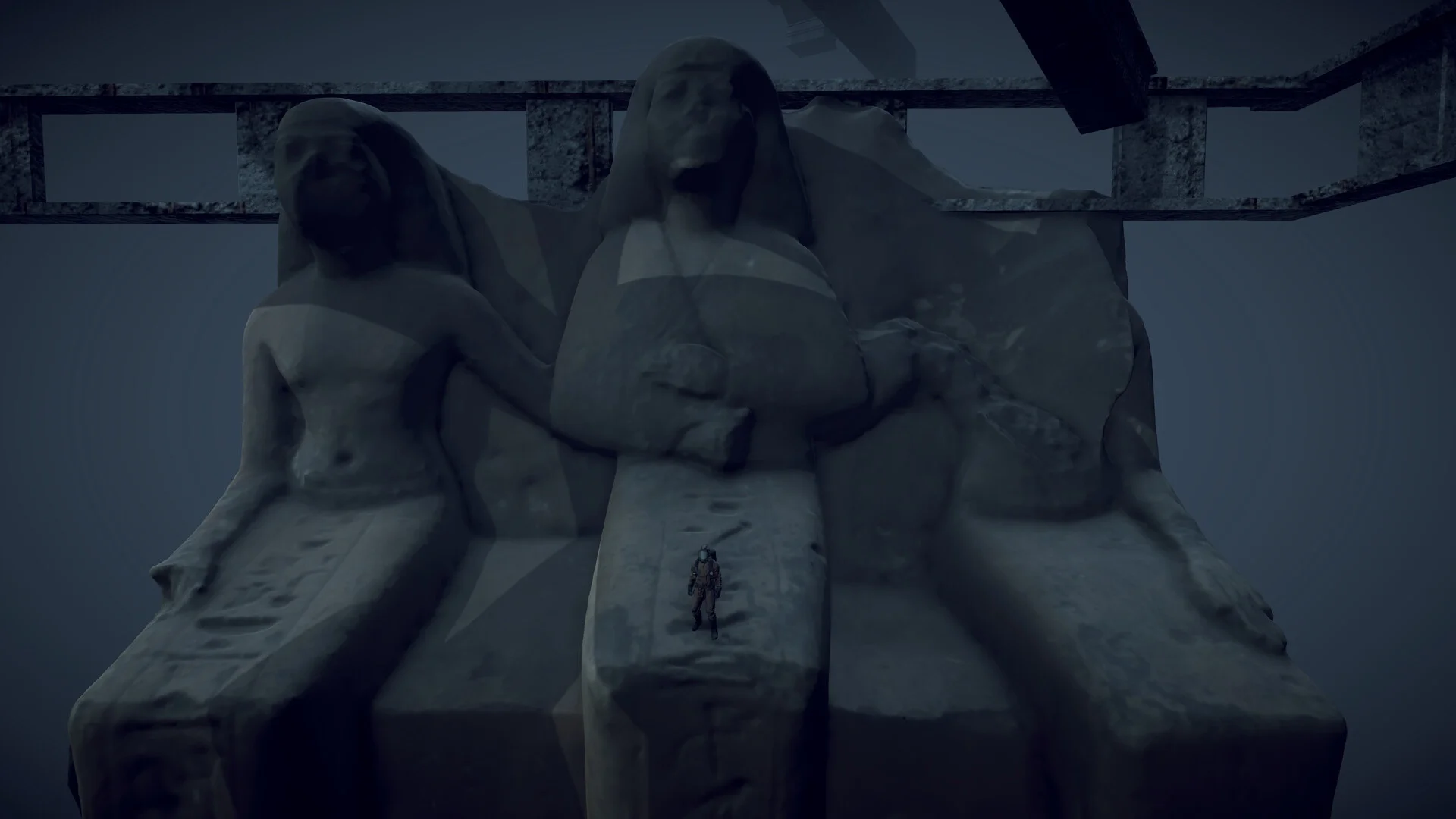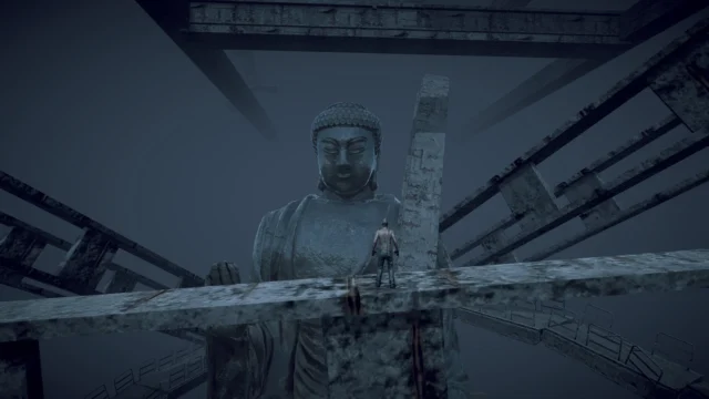 本作でまず目を引くのは、そのとんでもないスケール感です。巨大な石像や騎馬像、仏像、そして無数の柱が立ち並ぶ廃墟群が舞台となっており、プレイヤーキャラクターはそれらの前では米粒ほどの大きさにしか見えません。荒廃した巨大建造物の上を渡り歩いたり、朽ちた足場を伝って高所を進んだりと、高低差を活かした探索が楽しめる作りになっています。