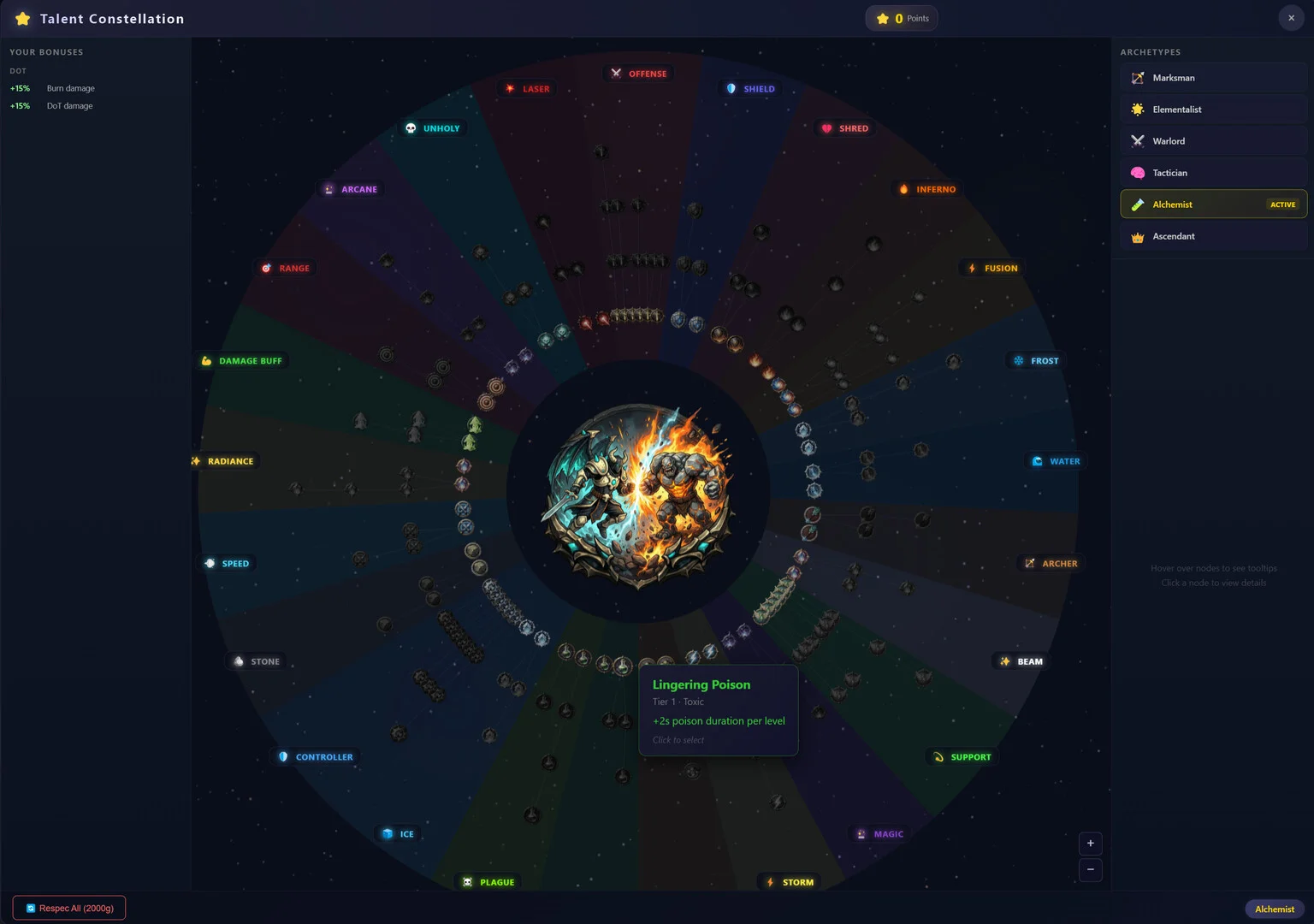 スキルシステムも凝っていて、星座のように広がるタレントツリーが用意されています。「マークスマン」「エレメンタリスト」「ウォーロード」「タクティシャン」「アルケミスト」「アセンダント」といった複数のアーキタイプが存在し、それぞれ異なるビルド方向性を持っています。スキルポイントのリセット機能もあるようなので、試行錯誤しながら自分好みのビルドを探せるでしょう。