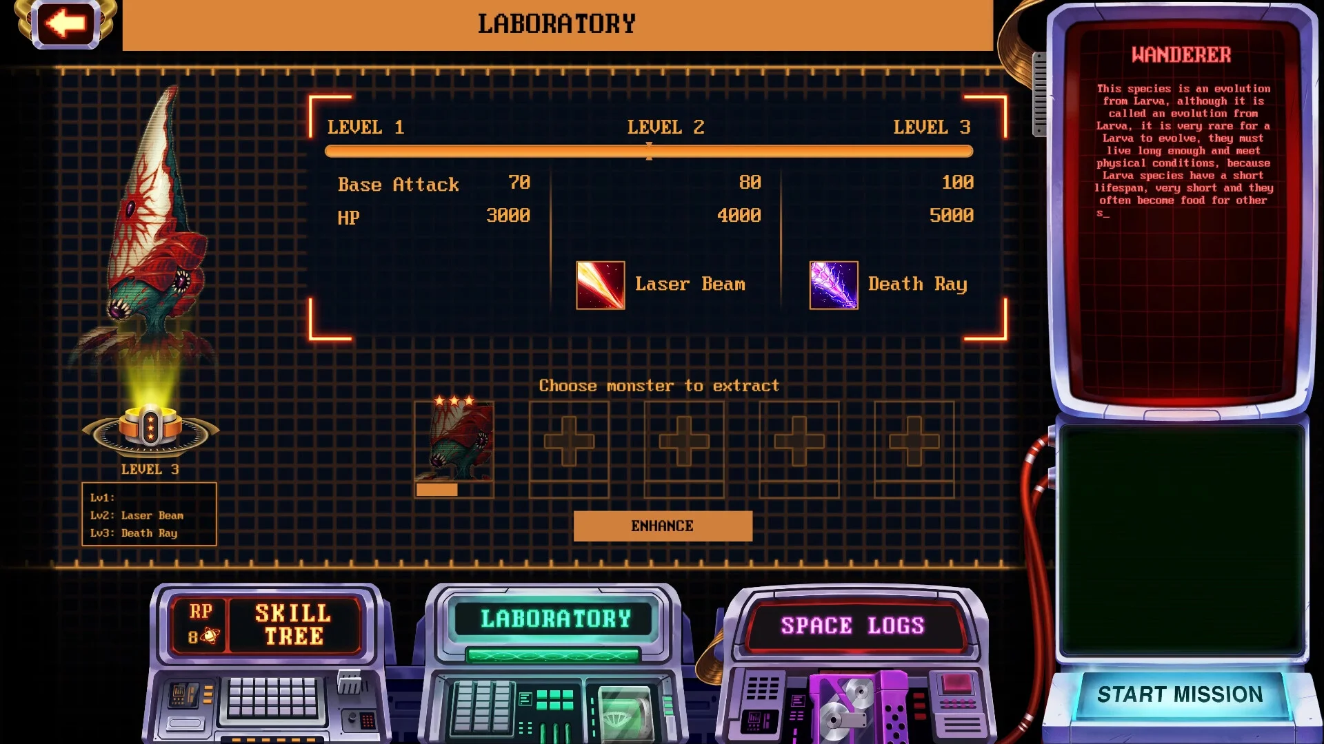ユニットはスキルツリーで強化可能。研究ポイントを消費して各ユニットの能力をアンロックしていく仕組みで、戦略の幅を広げていけます。またラボ画面では登場するユニットや生物の詳細情報を確認でき、世界観の掘り下げも楽しめそうです。
