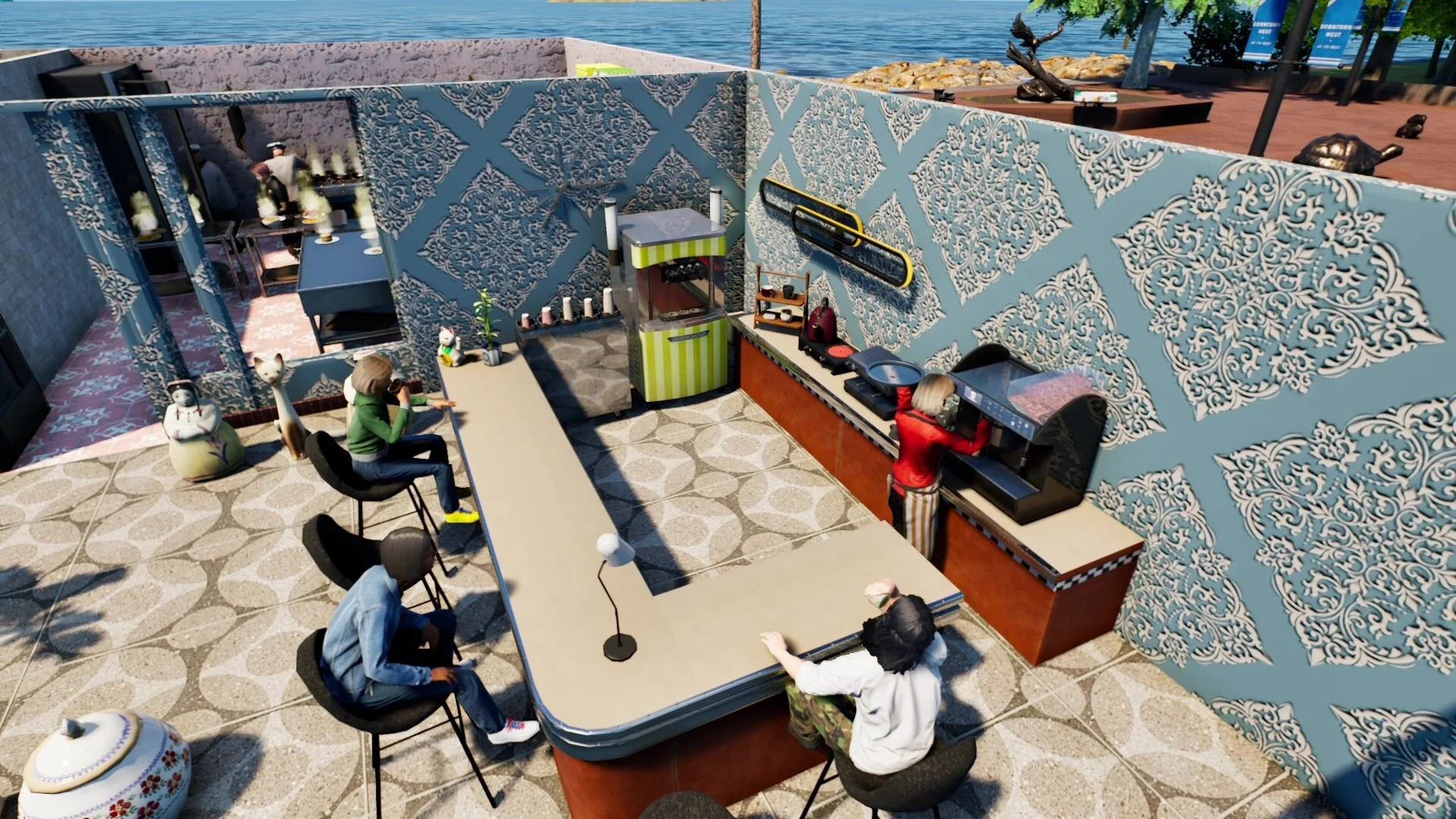 舞台となるのは、青い海を望む開放的なロケーション。夕焼けに照らされる広々としたテラス席や、ネオンが輝く夜のバーカウンター、雪が舞う冬の夜景など、時間帯や季節によって表情を変える美しいビジュアルも本作の大きな魅力です。昼は明るくリゾート感あふれる雰囲気で、夜はライトアップされた幻想的な空間に早変わりするなど、同じ店でも全く違う顔を見せてくれます。