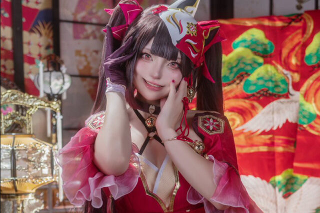 アコスタ池袋でのイベント出展となった今回のコスプレは、ピンク色の照明による撮影で、大麗花の優雅さとセクシーさが見事に表現されています。