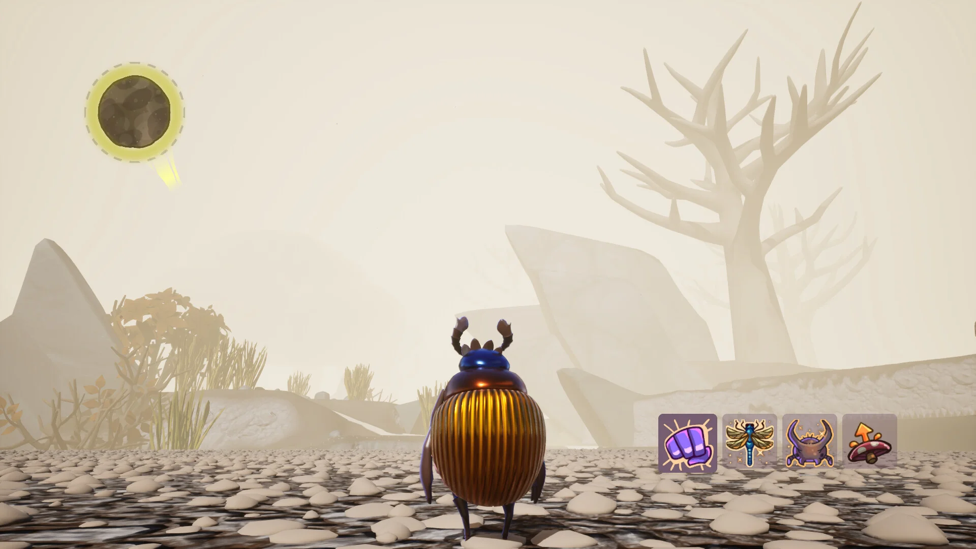 また、フンコロガシは飛行能力も持ち合わせており、広大なマップを自由に飛び回ることも可能です。紫や黄色の花が咲き乱れる草原、青く輝く水辺、荒涼とした岩場など、バラエティ豊かな環境が用意されており、探索のしがいもありそうです。カートゥーン調のカラフルなグラフィックが明るく楽しい雰囲気を演出しており、見た目のかわいらしさと物理ゲームのカオスさが絶妙なバランスで共存しています。