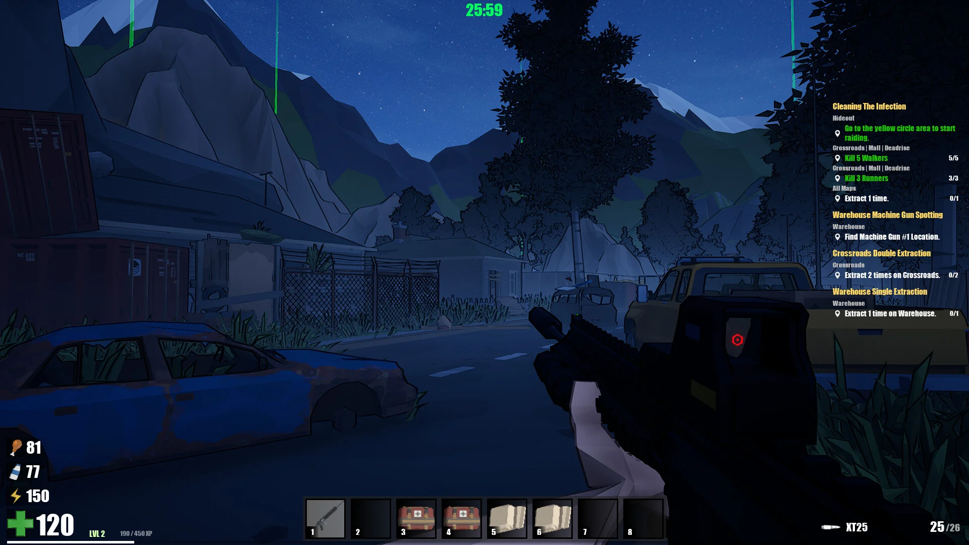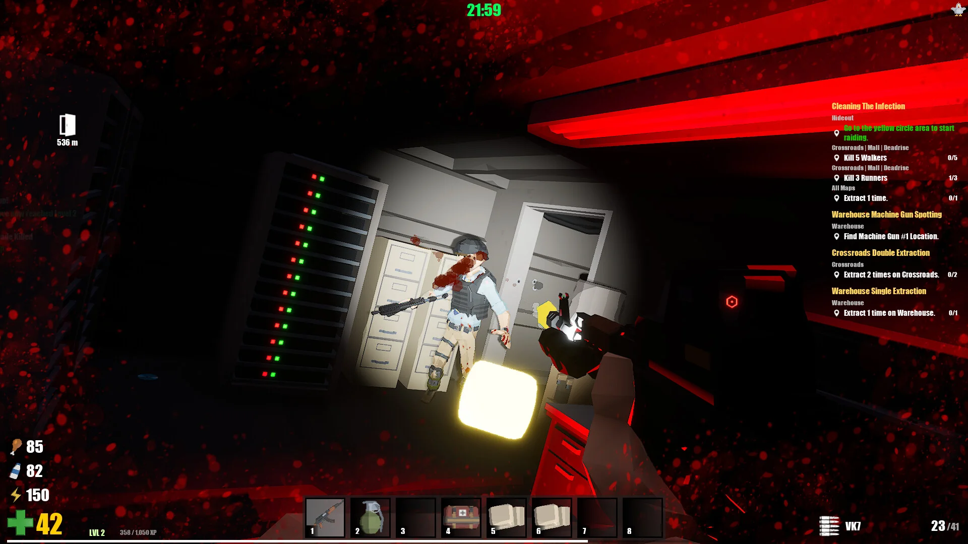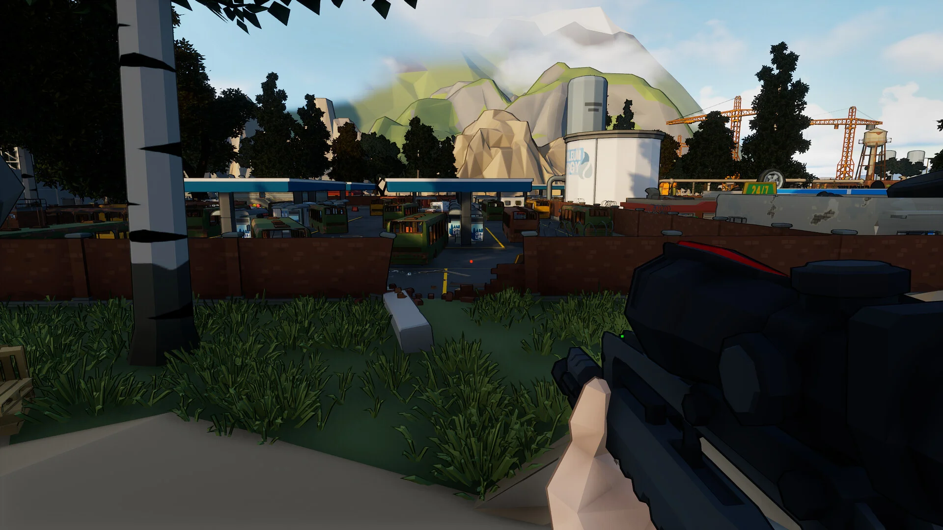 ローポリゴンで描かれるグラフィックは一見シンプルに見えますが、曇り空の下に広がる荒廃した街並みや、不気味な照明に照らされた屋内施設など、雰囲気の作り込みは丁寧です。廃墟化したスーパーマーケットや薄暗い倉庫、赤いライトが不気味に照らす通路まで、ロケーションごとに異なる緊張感が漂います。