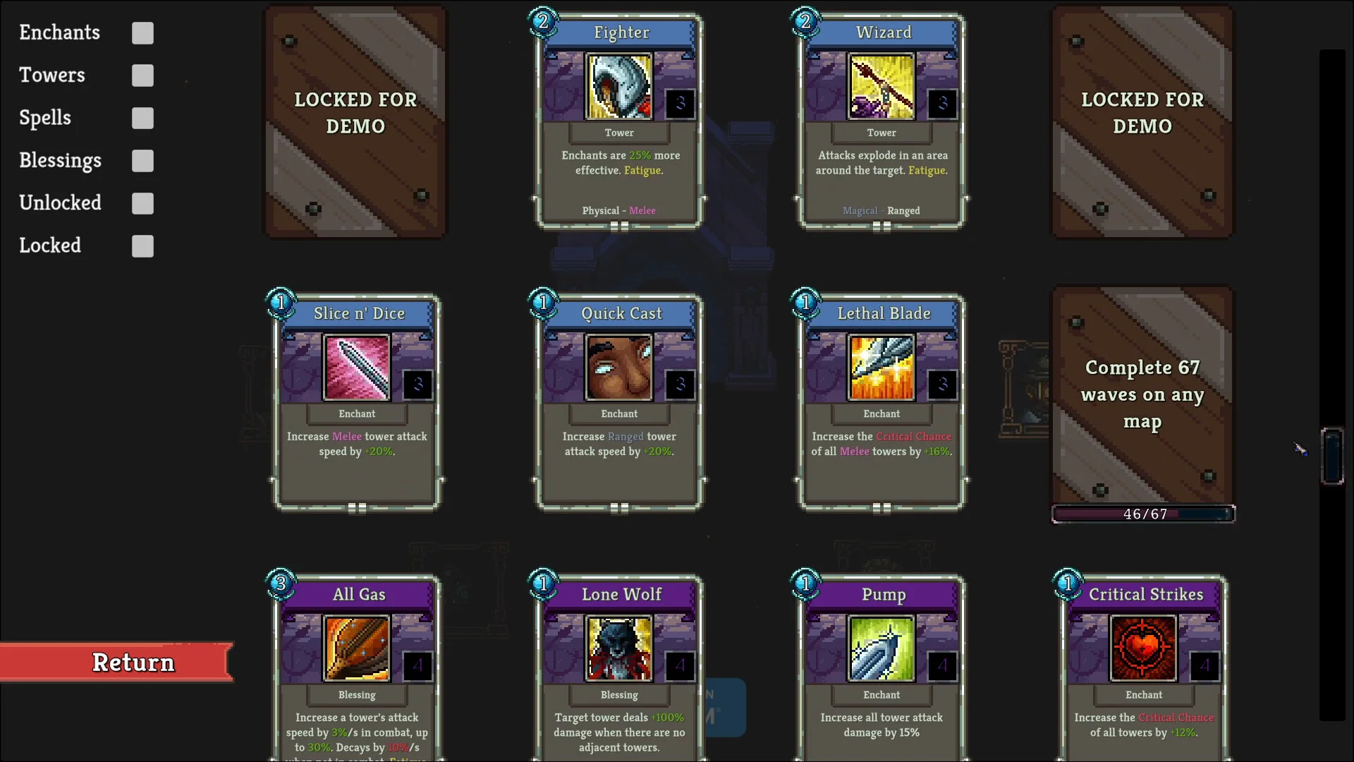 本作にはタワー・エンチャント・スペル・ブレッシングなど多彩なカテゴリのカードが用意されており、特定の条件を達成することで新たなカードが解放されていきます。コレクション要素としての収集欲を刺激しつつ、新しいカードが加わるたびに戦略の選択肢が広がる設計です。
