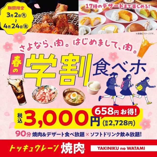 ワタミ株式会社は2月20日、「焼肉の和民」にて、2026年3月2日(月)から4月24日(金)の期間限定で「春の学割食べホ」プランを税込3,000円で販売すると発表しました。... -