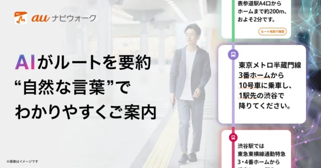 KDDI株式会社と株式会社ナビタイムジャパンは12月3日、歩行者向けナビゲーションアプリ『auナビウォーク』において、AIが自然な言葉でルート検索結果を表示する「AIル...